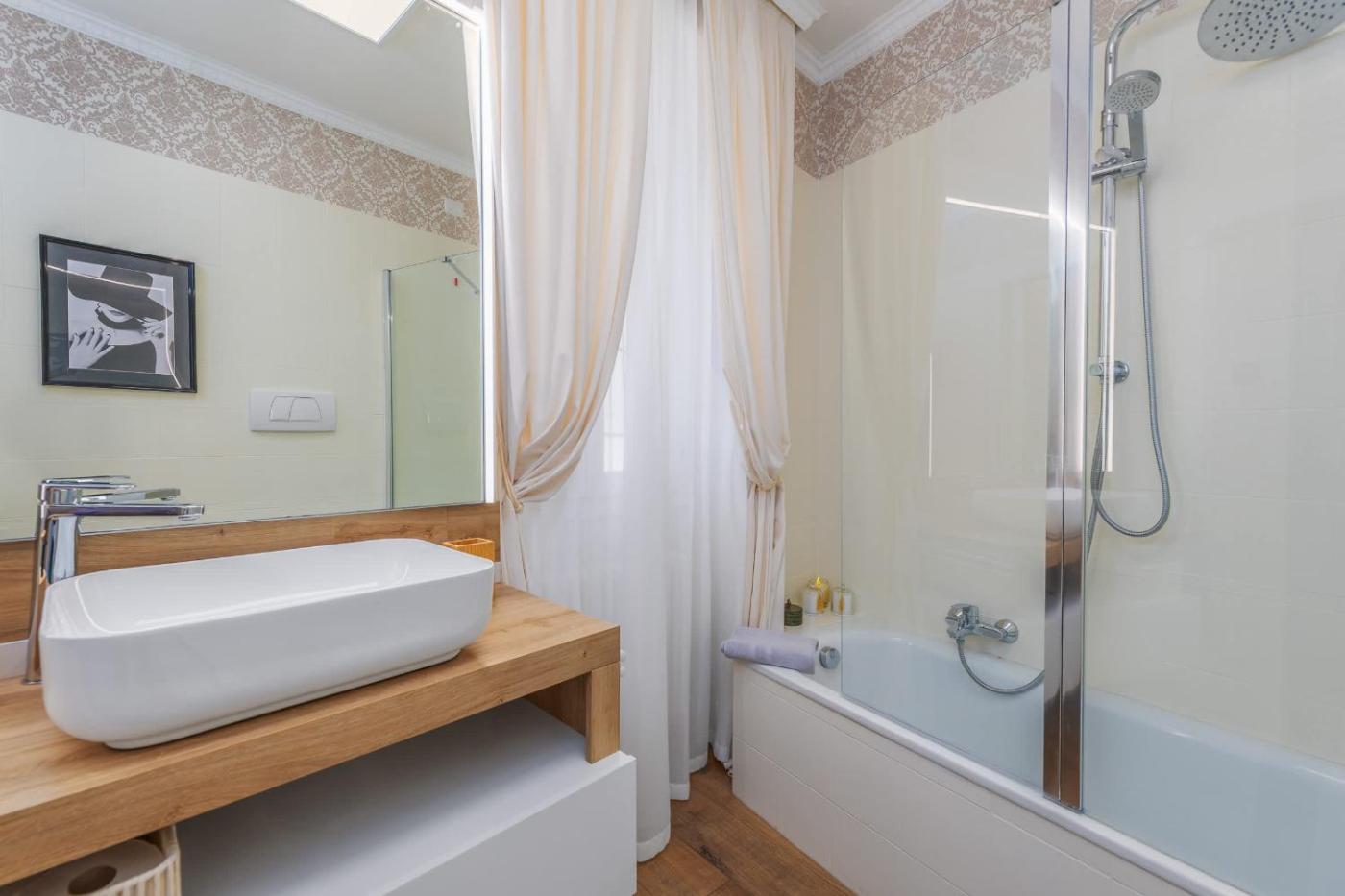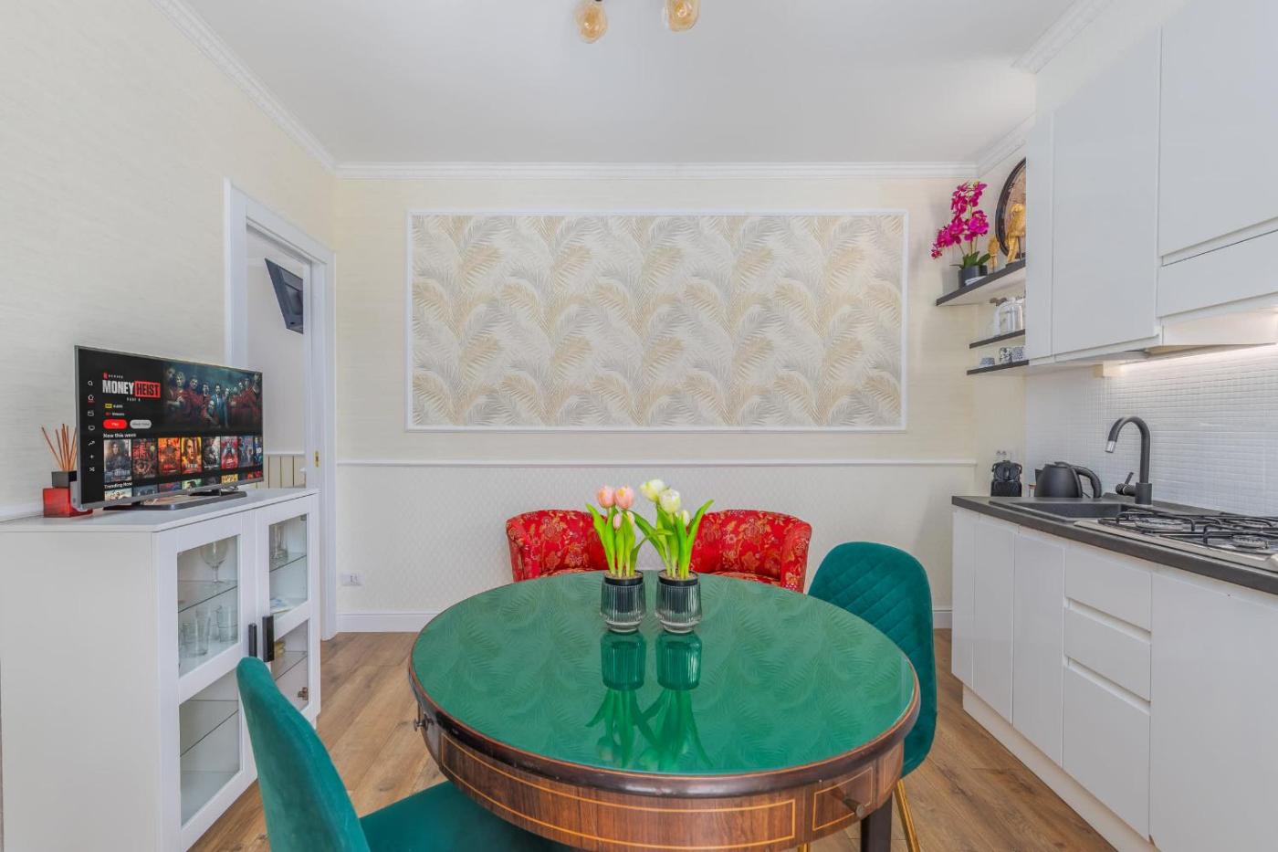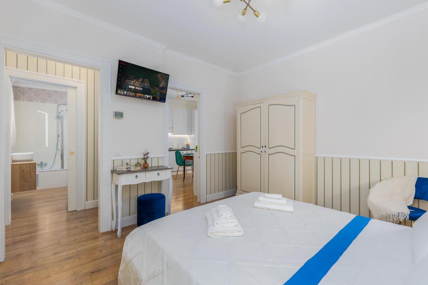 One-Bedroom Apartment. The apartment has 1 bedroom and 1 bathroom with a bath and free toiletries. The well-fitted kitchen features a stovetop, a refrigerator, kitchenware and an oven. The apartment features a washing machine, a tea and coffee maker, a wardrobe, heating, as well as a TV. The unit has 1 bed.